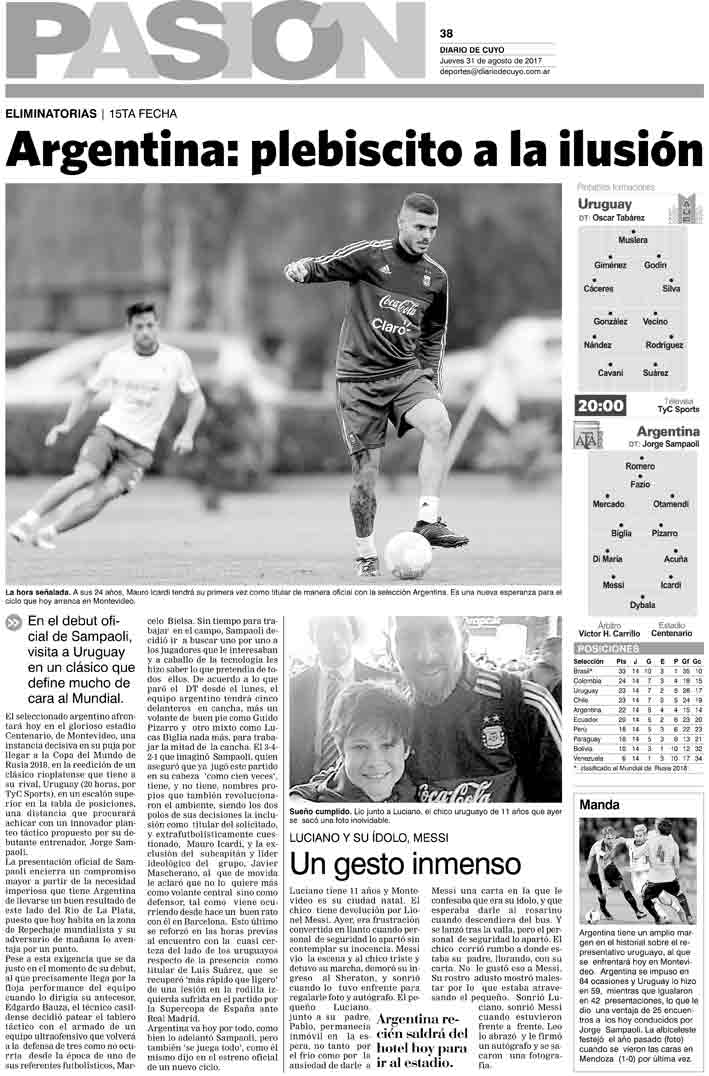 Diario de Cuyo | HOME | Noticias Tapa Pasión 31 de Agosto de 2017 Por Redacción Diario de Cuyo 30/08/2017 · 0:00 Escuchar la noticia Escuchar la noticia Your browser doesn’t support HTML5 audio Ver los comentarios ›