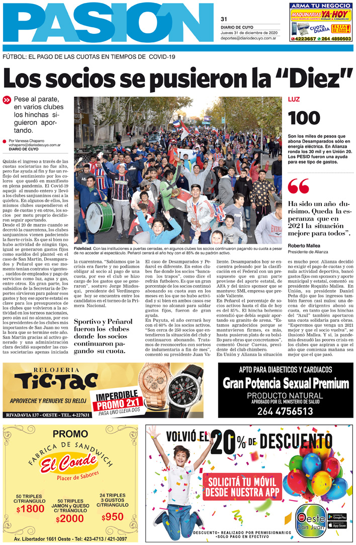 Diario de Cuyo | HOME | Noticias Tapa Pasión 31 de Diciembre del 2020 Por Redacción Diario de Cuyo 30/12/2020 · 0:00 Escuchar la noticia Escuchar la noticia Your browser doesn’t support HTML5 audio Ver los comentarios ›