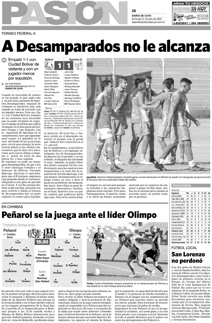 Diario de Cuyo | HOME | Noticias Tapa Pasión 31 de Julio del 2022 Por Redacción Diario de Cuyo 30/07/2022 · 0:00 Escuchar la noticia Escuchar la noticia Your browser doesn’t support HTML5 audio Ver los comentarios ›