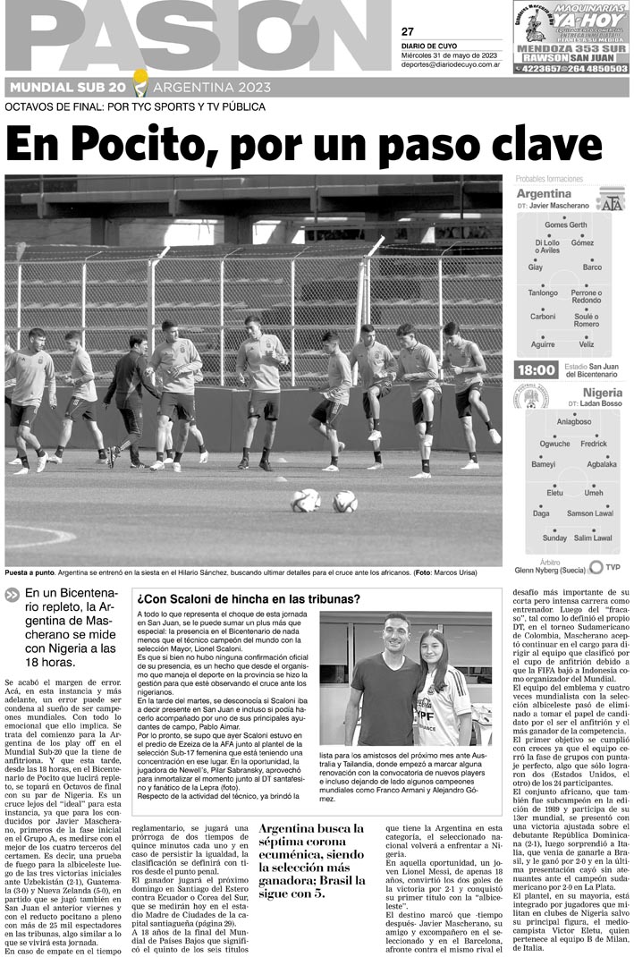 Diario de Cuyo | HOME | Noticias Tapa Pasión 31 de Mayo del 2023 Por Redacción Diario de Cuyo 30/05/2023 · 0:00 Escuchar la noticia Escuchar la noticia Your browser doesn’t support HTML5 audio Ver los comentarios ›