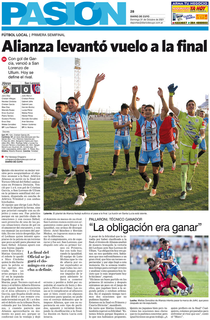 Diario de Cuyo | HOME | Noticias Tapa Pasión 31 de Octubre del 2021 Por Redacción Diario de Cuyo 30/10/2021 · 0:00 Escuchar la noticia Escuchar la noticia Your browser doesn’t support HTML5 audio Ver los comentarios ›