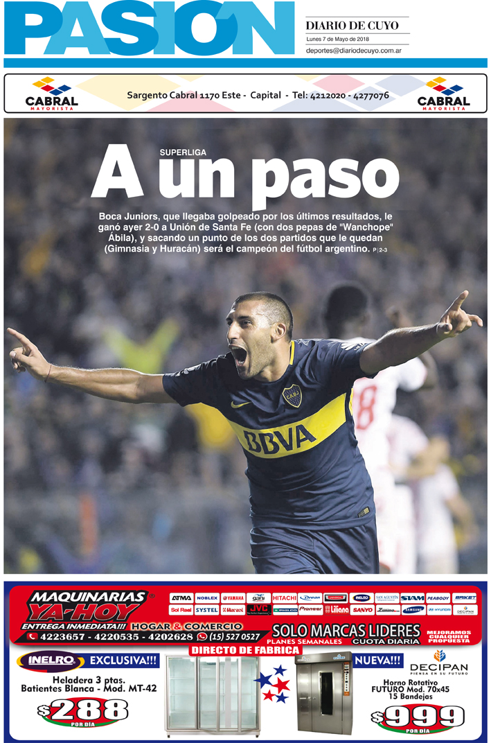 Diario de Cuyo | HOME | Noticias | Tapa Pasión Tapa Pasión 7 de Mayo 2018 Por Redacción Diario de Cuyo 06/05/2018 · 0:00 Escuchar la noticia Escuchar la noticia Your browser doesn’t support HTML5 audio Tapa Pasión Ver los comentarios ›