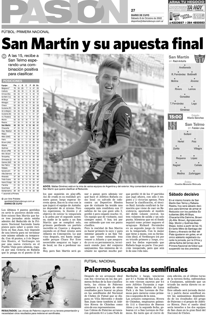 Diario de Cuyo | HOME | Noticias Tapa Pasión 8 de Octubre de 2022 Por Redacción Diario de Cuyo 07/10/2022 · 0:00 Escuchar la noticia Escuchar la noticia Your browser doesn’t support HTML5 audio Ver los comentarios ›