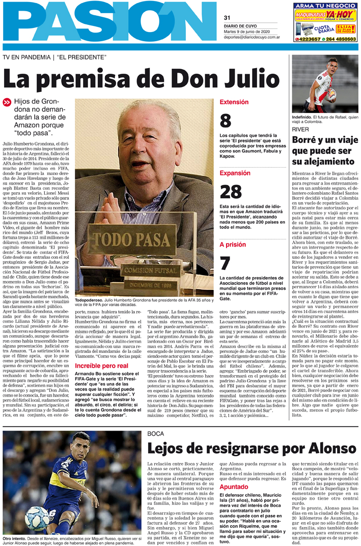 Diario de Cuyo | HOME | Noticias | Tapa Pasión Tapa Pasión 9 de Junio de 2020 Por Redacción Diario de Cuyo 08/06/2020 · 0:00 Escuchar la noticia Escuchar la noticia Your browser doesn’t support HTML5 audio Tapa Pasión Ver los comentarios ›