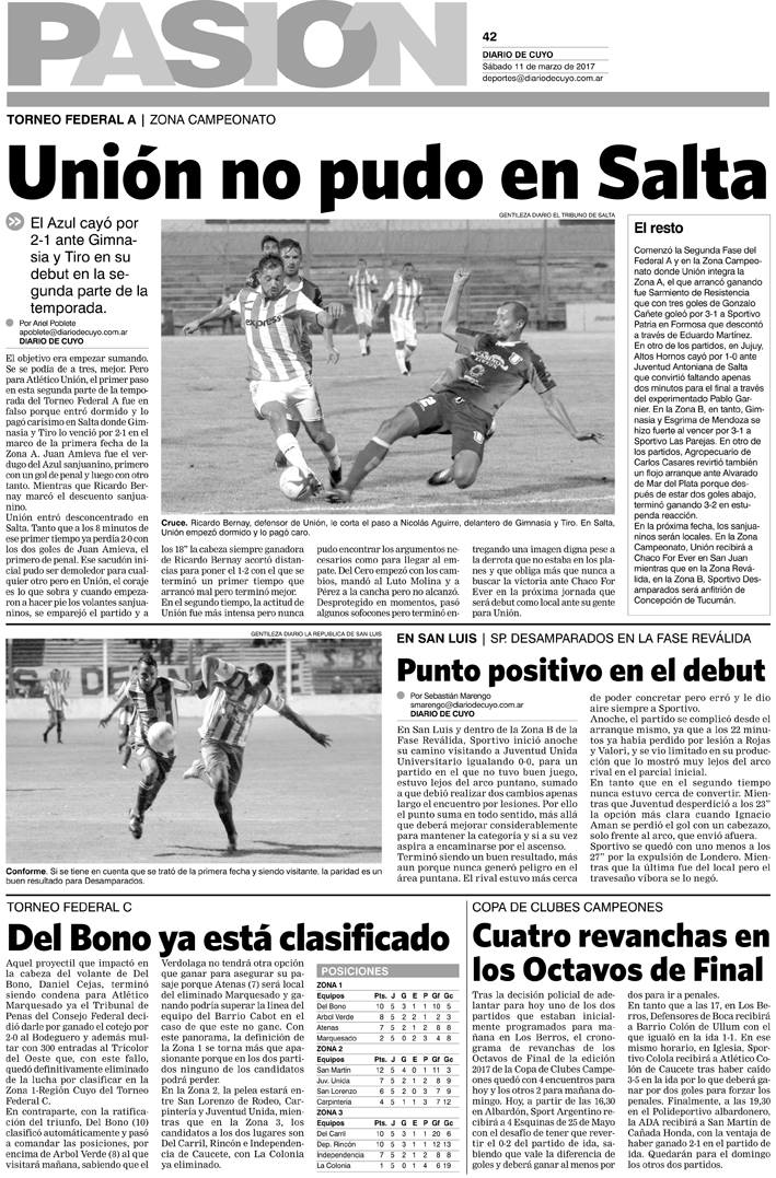 Diario de Cuyo | HOME | Noticias Tapa Pasión Deportiva 11 de marzo de 2017 Por Redacción Diario de Cuyo 11/03/2017 · 0:00 Escuchar la noticia Escuchar la noticia Your browser doesn’t support HTML5 audio Ver los comentarios ›
