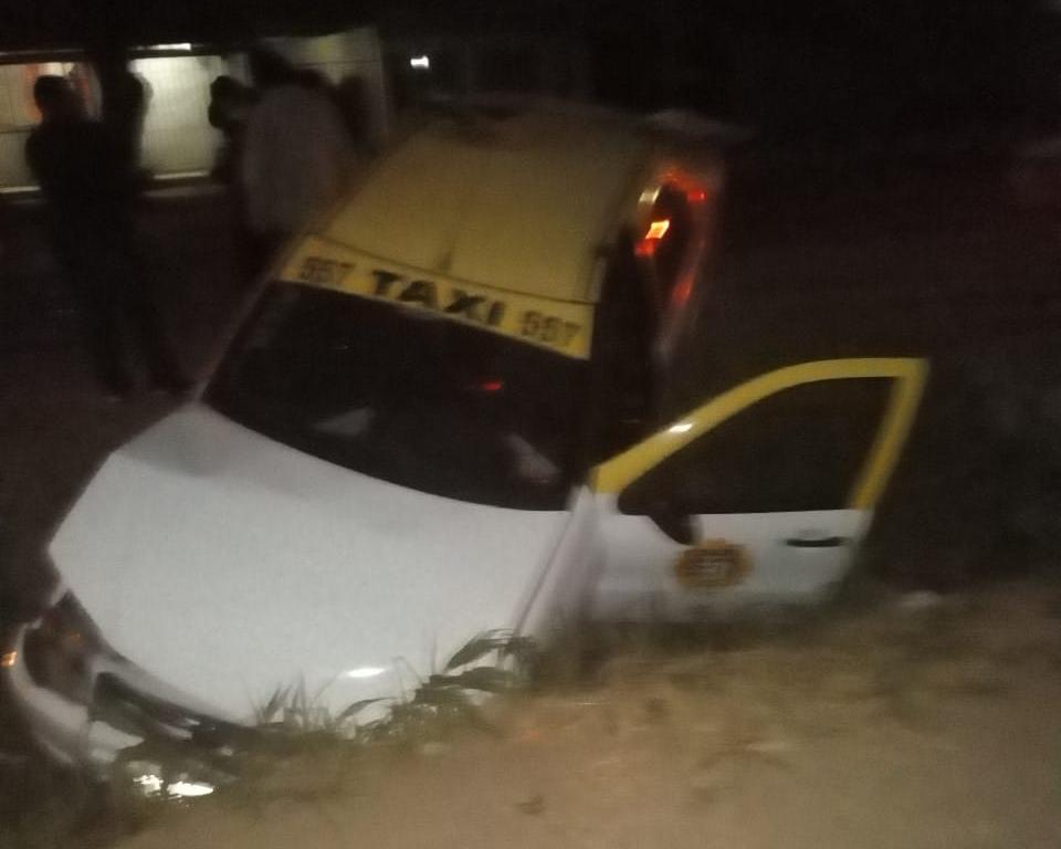 Un taxi marca Fiat Siena se dirigía de Este a Oeste cuando de golpe se le cruzó un motociclista que circulaba en zigzag. El chofer lo esquivó y el taxi se fue hacia la zona de banquina, donde impactó con un camión estacionado, hizo un trompo sobre la calle y terminó cayendo a un zanjón.