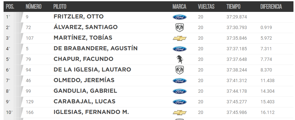 De principio a fin resultó el dominio del Ford conducido por el joven representante del equipo Emanuel Moriatis Competición. Fritzler no dejó duda alguna durante las 20 vueltas recorridas al trazado entrerriano controlando cada uno de los ataques propinados por su escolta Santiago Alvarez (Dodge).