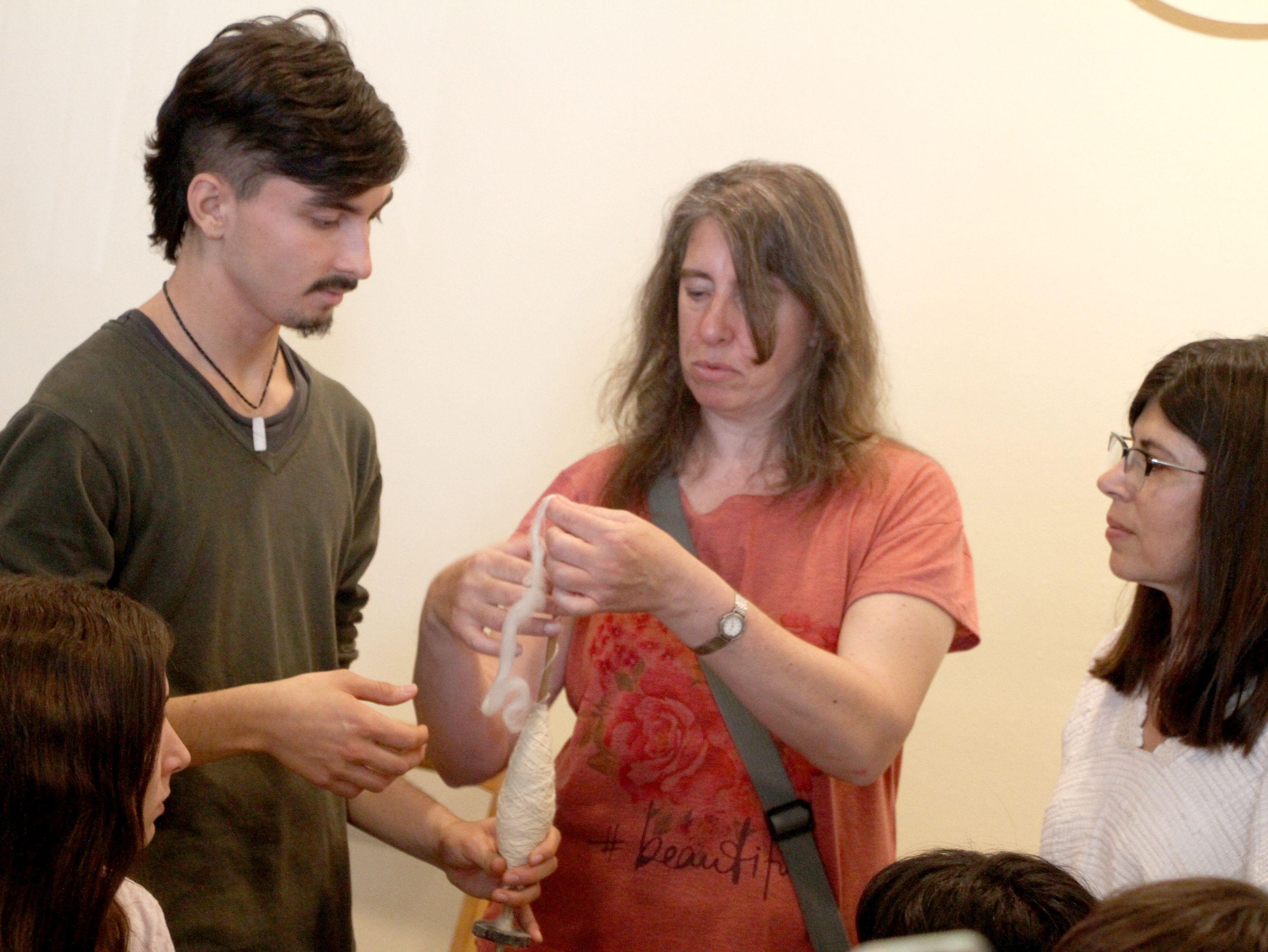 Tras un recorrido por la muestra y charlas de Gabriela Riveros (artista visual) y Lorena Re (Museo Gambier), se profundizó el cara a cara de los jóvenes con las artesanas, Clara, Mara Luna y María Eugenia Alba -acompañadas por la directora del Mercado Artesanal, Miriam Atencio- cuyo objetivo era la transmisión de saberes y técnicas de la textilería ancestral sanjuanina. El teñido de las lanas, el hilado y el trabajo en telar atraparon a los futuros artistas, que mostraron algo de lo que aprenden en la facultad (tramas, tintes, costura) y pudieron visualizar todo el proceso que conlleva una pieza. En ese camino, tuvieron la posibilidad de conocer a sus autoras y sobre todo "el honor" de recibir de ellas el saber hacer transmitido desde tiempos remotos. Y si en algo coincidieron todos, es que este tipo de vivencias no sólo les deja a las nuevas generaciones el secreto de una técnica o la semilla de una vocación; sino que sobre todo les enseña a valorar y a apreciar el trabajo y los conocimientos que una pieza encierra.