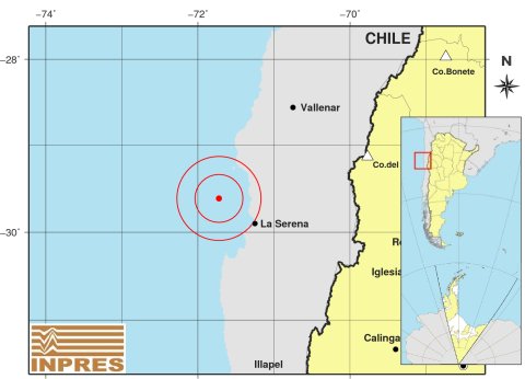 El epicentro se ubicó 373 kilómetros al Noroeste de San Juan; 454 kilómetros al Noroeste de Mendoza; y 53 kilómetros al Noroeste de Coquimbo, en el país vecino.