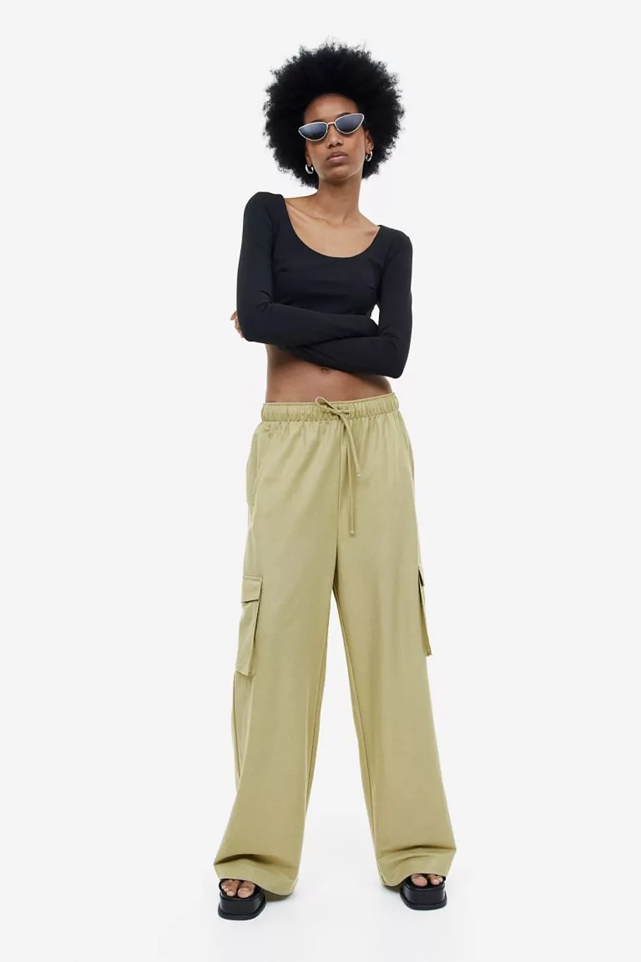 Este pantalón cargo de tiro alto, con cintura elástica y cordones es perfecto para un look informal y cómodo. Su color, verde oliva, le confiere una gran versatilidad.