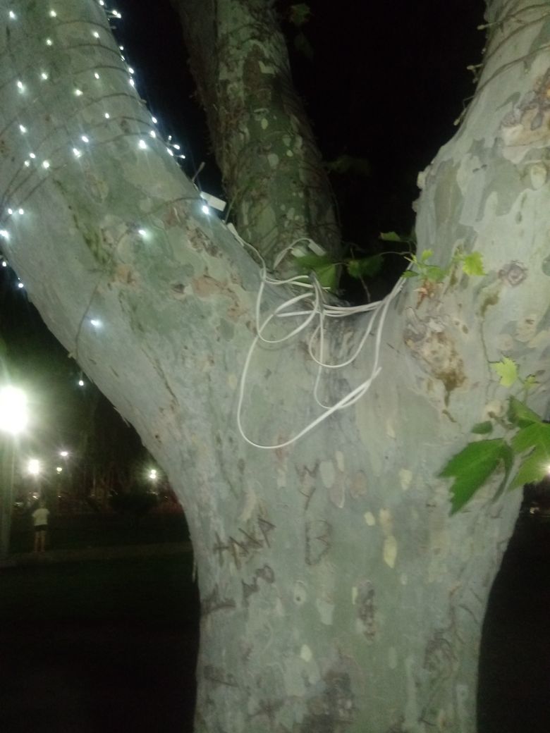 Un lector envió una imagen y el siguiente comentario: “A la Municipalidad de Santa Lucía, ya terminaron las fiestas. Hay +arboles con las luces puestas, hasta llaves térmicas tienen clavadas los árboles. Arreglenlo, por favor”.