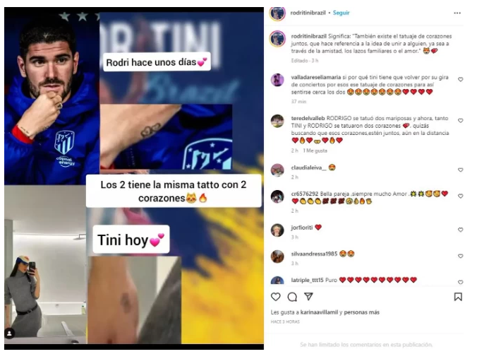 Quien se encargó de hacer visible esta cuestión fue el usuario de Instagram rodritinibrazil. “Los dos tienen el mismo tattooo con dos corazones”, indicaron, además de señalar el significado del mismo: “Hace referencia a la idea de unir a alguien, ya sea a través de la amistad, los lazos familiares o el amor”.