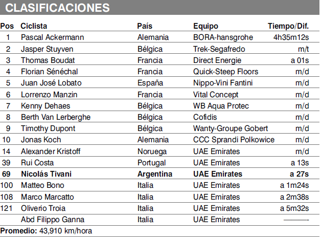 Una buena actuación tuvo ayer Nicolás Tivani en su debut como "stagieri" (aprendiz) en el equipo UAE Emirates (UWT) que participó de la 98va edición de la "Clásica Bruselas", una prueba de 206 kilómetros con categoría HC (Histórica Clásica) en la UCI (Unión Internacional de Ciclismo). El sanjuanino culminó en la posición 69 a 27 segundos del alemán Pascal Ackermann (Bora-Hansgrohe) que se impuso con autoridad en el sprint con el que se definió la carrera. El campeón germano fue más fuerte que el belga Jasper Stuyven (Trek-Segafredo) en los metros finales, luego que una rodada de cuatro ciclistas, ocurrida a 200 metros de la meta, complicara el embalaje.
