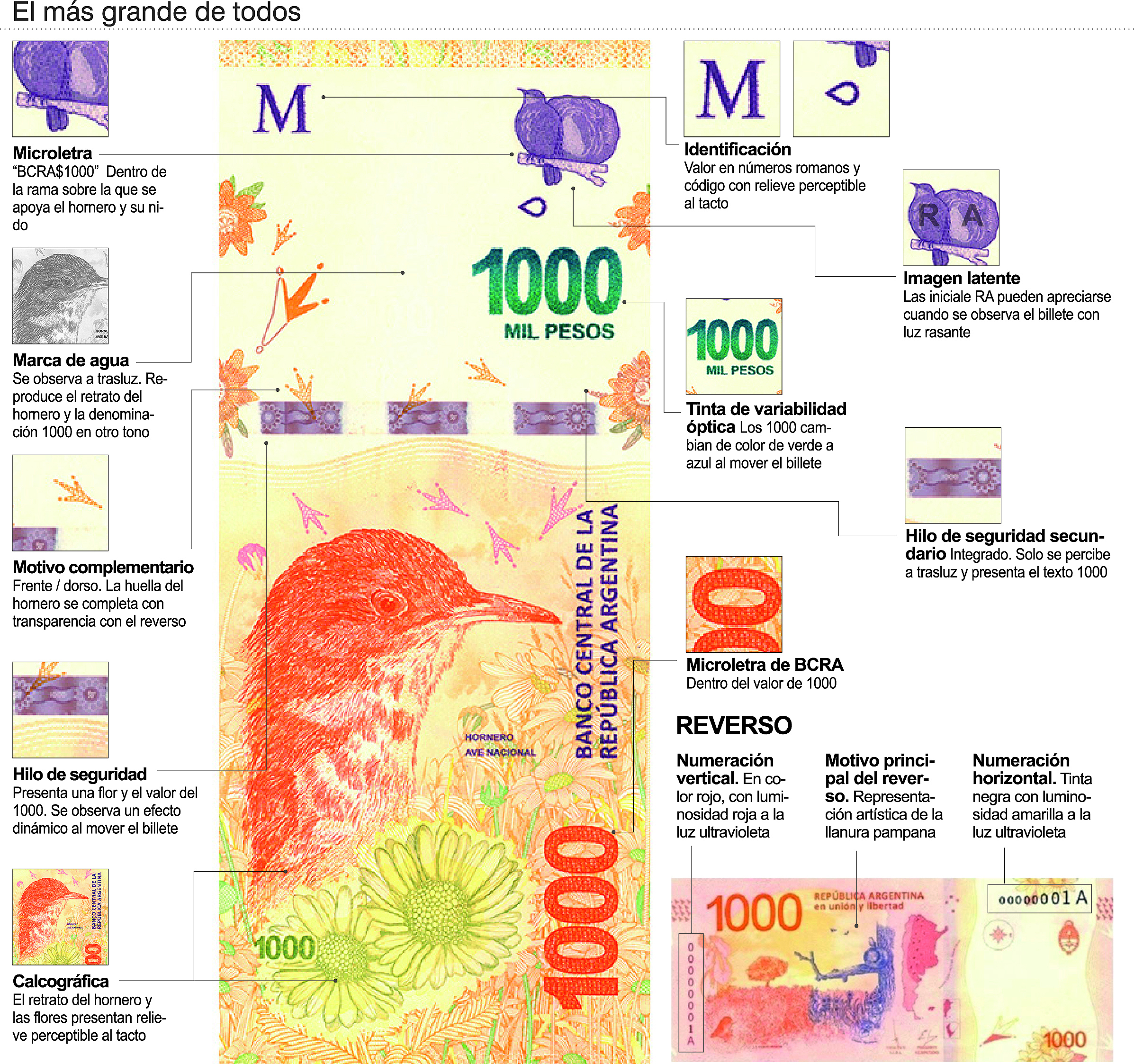 “Entre las principales medidas de seguridad del nuevo billete, se destacan en el anverso, la marca de agua, que reproduce el retrato del hornero y presenta, en la parte inferior, la denominación “1000”, expresó el comunicado del Central. El hilo de seguridad principal cuenta con una banda marrón. Además, posee un hilo de seguridad secundario, una banda que puede verse a trasluz. Asimismo, como motivo de complementación frente-dorso, muestra una huella del ave, que se completa por transparencia con el reverso”.