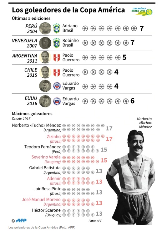 El argentino Norberto Méndez (17) y el brasileño Zizinho (17) son los máximos artilleros históricos. El uruguayo Severino Varela (15) y el peruano Teodoro Fernández (15) continúan el listado. El peruano Paolo Guerrero (11) y el chileno Eduardo Vargas (10) son los dos jugadores que participarán del torneo que suman más tantos.