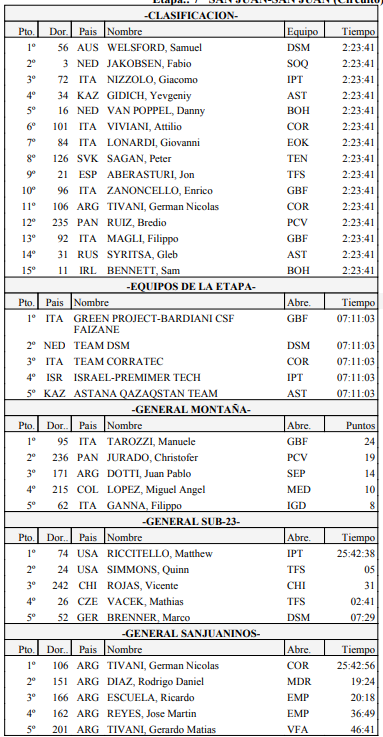 La clasificación oficial de la séptima y última etapa de la Vuelta a San Juan 2023 definió las posiciones finales de la 39na, edición. A continuación, las principales.
