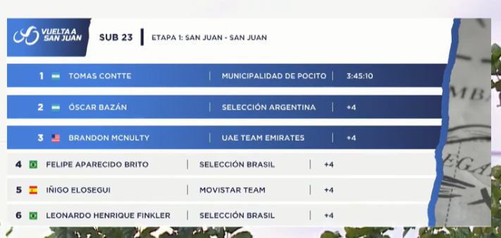 Diario de Cuyo | HOME | Noticias | Vuelta a San Juan 2020 Tomás Contte, el mejor Sub 23 y argentino de la general Por Redacción Diario de Cuyo 26/01/2020 · 0:00 Escuchar la noticia Escuchar la noticia Your browser doesn’t support HTML5 audio Clasificación Sub 23: Vuelta a San Juan 2020 Ver los comentarios ›