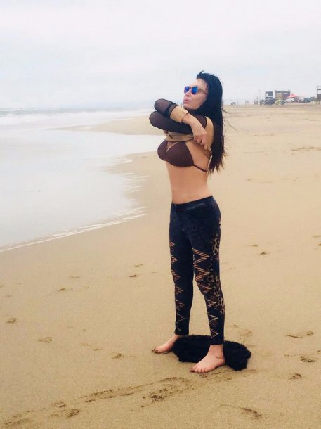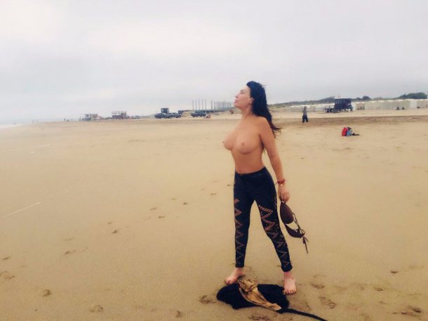 La diva se retrató en la playa y publicó en Twitter una secuencia de fotos en las que muestra un striptease. Primero se la ve completamente vestida, luego sin el saco, después sin la remera y por último, sin la parte de arriba de la bikini.