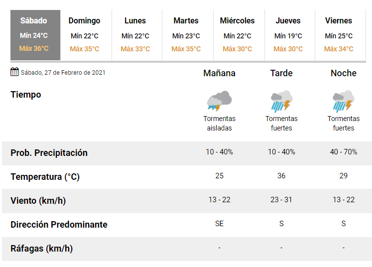Para este sábado, el Servicio Meteorológico Nacional informó que se espera tiempo inestable y altas temperaturas. La máxima alcanzará los 36°C mientras que la mínima será de 24°C.
