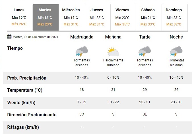 La máxima de este martes ascenderá hasta los 29°C mientras que la mínima caerá hasta 18°C. También estiman que las máximas hasta el domingo oscilarán entre los 31 y 35 grados.