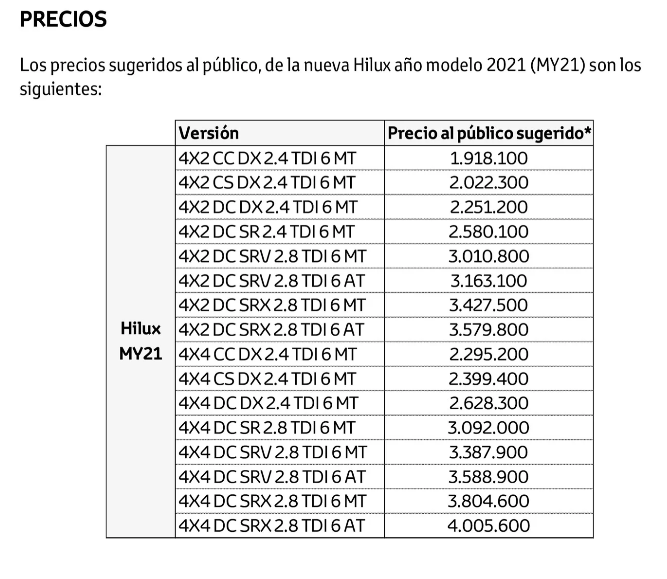 La nueva Hilux ya se vende en Argentina en 16 versiones y dos motorizaciones disponibles. La gama arranca en 1.918.100 pesos para la DX con chasis y el motor 2.4 de 150 CV y 400 Nm, y llega hasta 4.005.600 pesos para la versión tope de equipamiento SRX con el impulsor de 204 CV y caja automática.