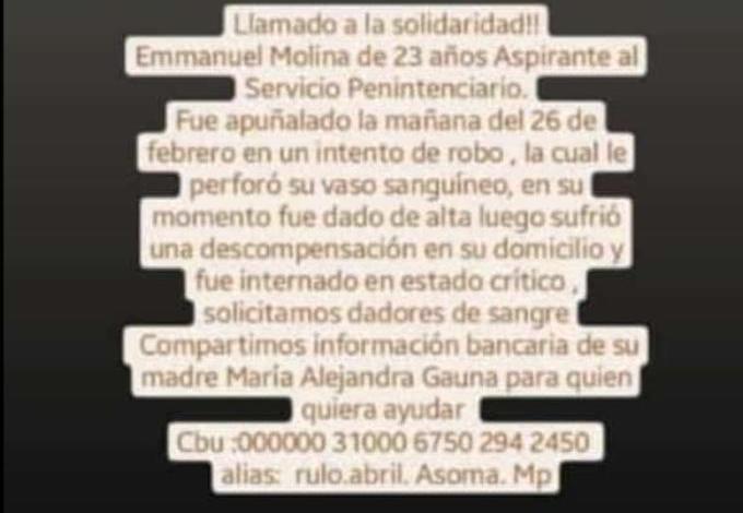 El pasado sábado, Emmanuel Molina, de 23 años, salió de la casa en la que vive junto a su madre y sus hermanos y caminó las tres cuadras que lo separaban de la parada del colectivo. Habían pasado unos minutos de las 6 y estaba nervioso, porque tenía que llegar a la universidad para rendir un examen que le permitiría avanzar en la carrera por llegar a ser Penitenciario. Sin embargo, nunca llegó a subir al colectivo. Una patota lo atacó para robarle y terminó dándole una puñalada que lo dejó en grave estado. Ahora, su familia espera que salga de Terapia Intensiva.