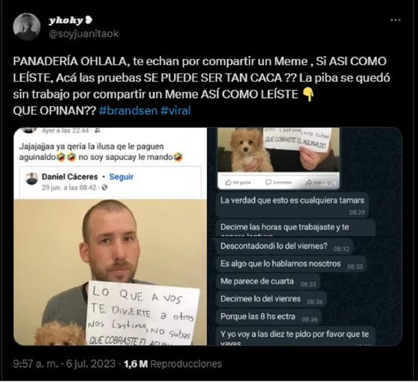 Las capturas del insólito intercambio fueron compartidas en Twitter por la usuaria @soyjuanitaok, quien denunció que lo hicieron público porque a a su amiga no le habían pagado la liquidación: "PANADERÍA OHLALA, te echan por compartir un Meme , Si ASI COMO LEÍSTE, Acá las pruebas SE PUEDE SER TAN CACA ?? La piba se quedó sin trabajo por compartir un Meme ASÍ COMO LEÍSTE QUE OPINAN?? #brandsen #viral".