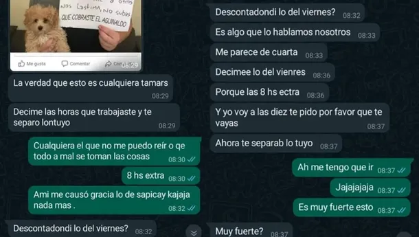 “Lo que a vos te divierte, a otros nos lastima. No subas que cobraste el aguinaldo”, se lee en el meme que tiene como protagonista al humorista Lucas Upstein y a un perrito, y que imita a la campaña contra la pirotecnia. Ante el posteo de Tamara, su jefe, identificado como Marcelo, le mando un mensaje por WhatsApp para llamarle la atención: “La verdad es que esto es cualquiera, Tamara. Decime las horas que trabajaste y te separo lo tuyo”.