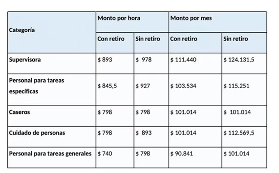 Quienes desempeñen sus funciones como trabajadores de tareas generales, el valor por hora pasará a $740 (con retiro) y de $798 (sin retiro). Mientras que el monto mensual mínimo es de $90.841 (con retiro) y de $101.014 (sin retiro).