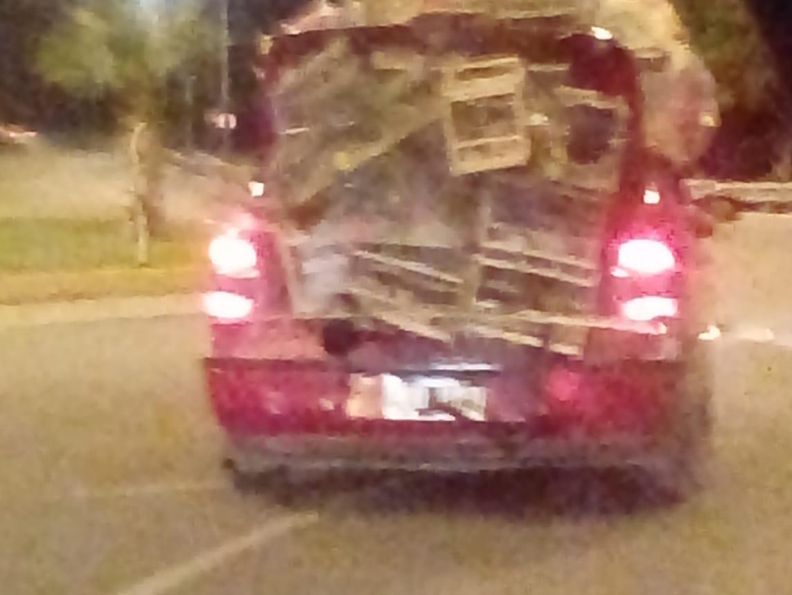 Un lector envió una imagen y el siguiente comentario: "Este señor transportaba en estas condiciones anoche (por el martes) jaulas con pájaros en el baúl de un auto, con el peligro que se ve esto representaba".