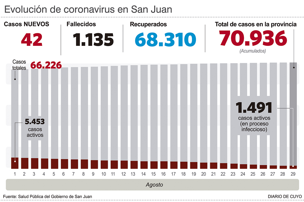 El Ministerio de Salud Pública de la provincia dio ayer por la tarde un nuevo parte sobre la situación del coronavirus. A tono con lo que viene sucediendo, se registraron apenas 42 contagios, el deceso de una mujer de 65 años y 126 personas permanecen internadas en áreas Covid-19. Así las cosas, San Juan acumula 70.936 casos (68.310 se recuperaron) y 1.135 muertes.
