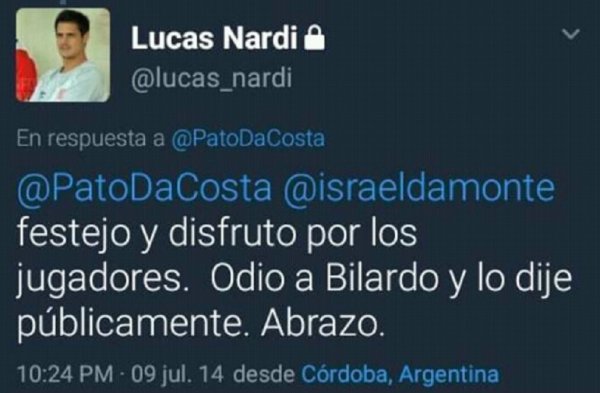 Nardi se vio envuelto en un escándalo que le terminó costando la destitución del club, pese a que desmintió haber escrito hace cuatro años en Twitter que "odiaba" a Carlos Bilardo, uno de los ídolos máximos de la institución.