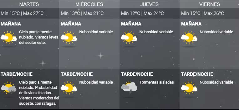El Servicio Meteorológico Nacional anunció para mañana martes una máxima de 27 grados con viento del este por la mañana y ráfagas del sector Sudeste por la noche con probabilidad de tormentas aisladas.