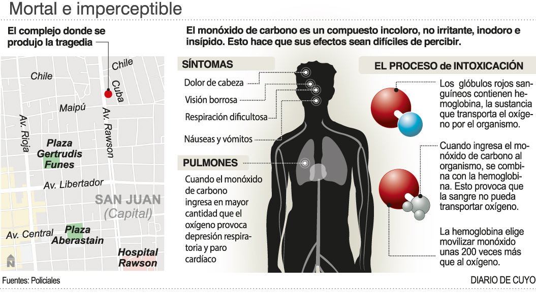 En la casa hubo gritos pero nadie pudo hacer nada para salvarlos. La hipótesis es que las víctimas sin darse cuenta empezaron a intoxicarse lentamente con el monóxido de carbono, que es un gas altamente tóxico producido por una combustión incompleta o deficiente. ¿Qué pasó? La principal teoría anoche era que el grave problema fue la escasa o directamente nula ventilación que había en el hogar. Todo indica que una vez que se fueron las hermanas, creyendo que los síntomas de una de ellas eran por su embarazo, los otros volvieron a cerrar la puerta. Las ventanas tampoco estaban abiertas y la sospecha es que las rendijas no funcionaban como corresponde. Los investigadores creen que ese ambiente cerrado casi herméticamente hizo que el calefactor fallara, pues ese tipo de aparato necesita oxígeno para quemar el monóxido. Una prueba realizada ayer en el hogar reveló que pudieron morir en sólo 10 minutos: los pesquisas cerraron todo, prendieron el calefactor y esperaron ese tiempo para medir el oxígeno en el ambiente. Ahí se dieron cuenta de que había sido consumido por completo, explicaron en la Justicia.