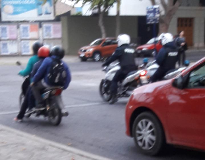 Un lector envió una imagen en la que se ve una moto ocupada por tres personas que espera para cruzar la calle al lado de dos motos policiales.