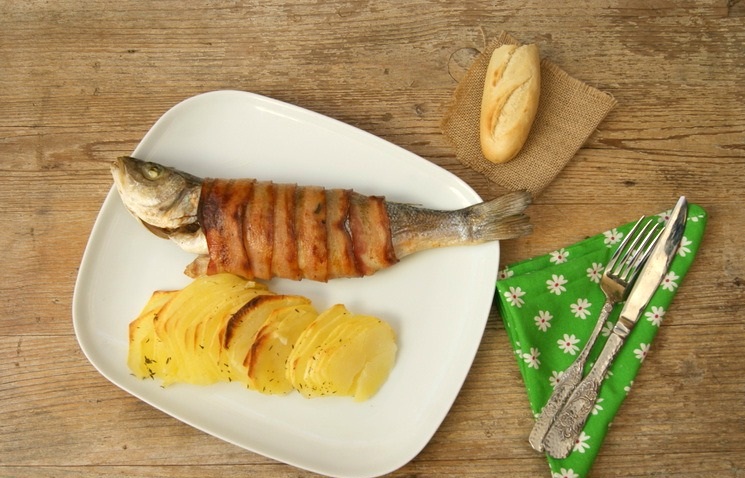 Ingredientes: 2 truchas mariposas, 100 gramos de panceta ahumada, 50 gramos de olivas negras descarozadas, 1 pimiento amarillo. 1 cebollita de verdeo, 100 gramos de queso parmesano.