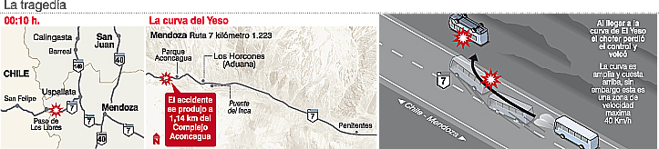 Habían ido el año pasado. Y la experiencia les resultó tan grata, que no le mezquinaron al trabajo para juntar algunos pesos y repetir: una semana de vacaciones en Santiago de Chile. Las dos parejas de Rawson con sus 3 pequeños hijos cumplían ayer su plan y ya cruzaban la cordillera mendocina, en Uspallata, con otros 35 pasajeros en un micro chileno de la firma ‘Turbus’. Pero en los primeros minutos de ayer, en una curva, el sueño de los sanjuaninos terminó en desastre. El chofer del colectivo, que viajaba a unos 100 km por hora, pasó de largo en una curva, volcó y dejó un tendal de muerte: 19 víctimas fatales, la mayor tragedia vial de la historia mendocina.