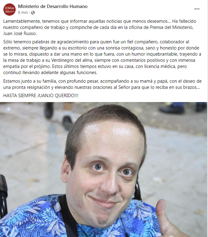 Inesperadamente, en las últimas horas falleció el periodista Juan José Russo. Reconocido y muy querido en el ambiente, el profesional de 37 años se desempeñaba en el área de Prensa del Ministerio de Desarrollo Humano.