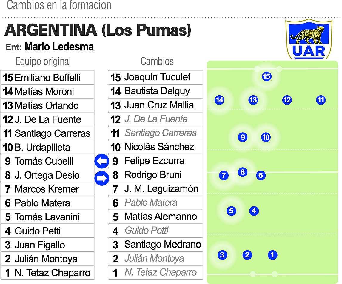 Se destaca el regreso para ser apertura de Nicolás Sánchez, uno de los rugbiers emblemas en la gestión de Ledesma y que solo disputó el primer tiempo en la derrota ante Francia. Luego, el DT lo borró y ahora tendrá su regreso.