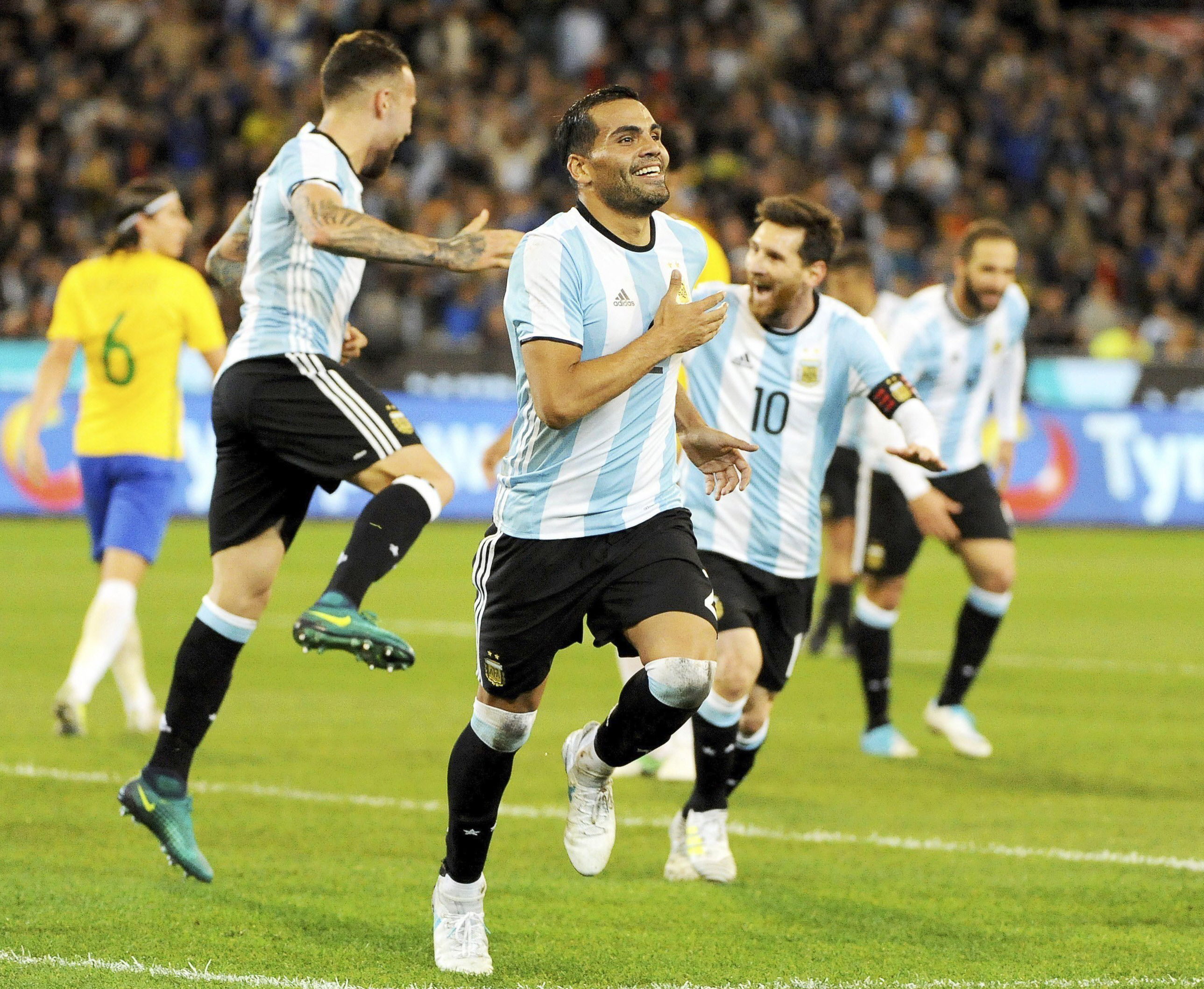 Oportuno. Gabriel Mercado estaba justo debajo del travesaño cuando la pelota rebotó y el ex River sólo tuvo que empujarla. Argentina triunfó 1-0 ante 95.000 espectadores, dejando al Brasil de Tite sin invicto.