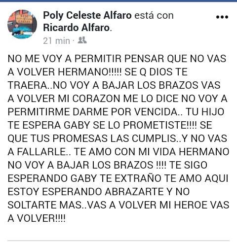 “No me voy a permitir pensar que no vas a volver hermano”, comenzó escribiendo la mujer en su perfil de Facebook. “Sé que Dios te traerá. No voy a bajar los brazos, vas a volver, mi corazón me lo dice. No voy a permitirme darme por vencida”, siguió.