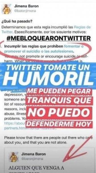 Jimena Barón es muy activa en Twitter, donde cuenta con más de dos millones de seguidores. Allí, en tono de broma, decidió de escribir un mensaje que puede dar a otras interpretaciones: “Alguien que venga a suicidarme”.