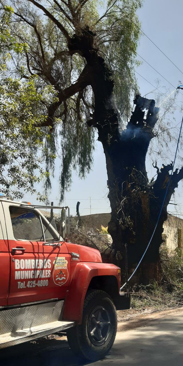 Este viernes, personal de Bomberos Municipales de Santa Lucía asistió a un incendio en las inmediaciones de avenida Libertador y La Callecita, límite entre Santa Lucía y 9 de Julio. De un árbol viejo brotaban llamas desde su interior y amenazaban con destruir una casa. Además había tendido eléctrico que podría haberse visto afectado.