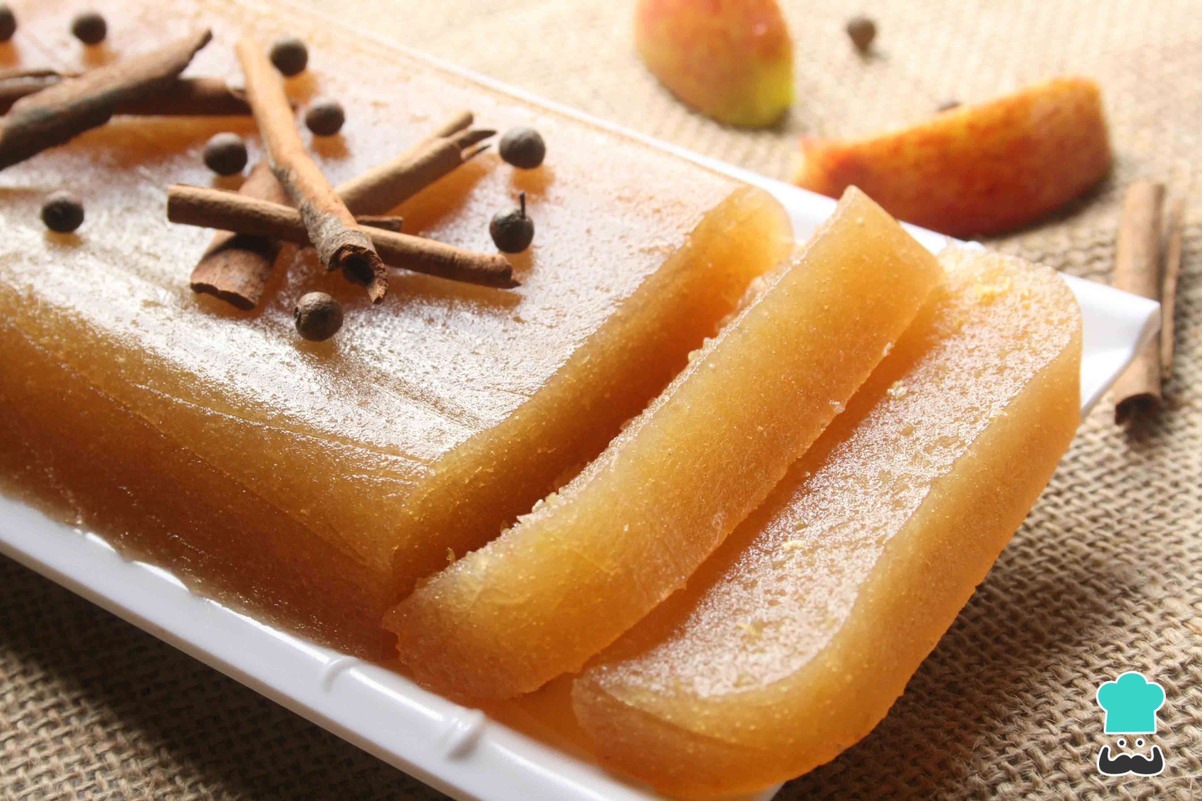 Pelar los membrillos, cortarlos al medio y retirar las semillas. Corte en cuartos o sextos dependiendo del tamaño de la fruta. Sumergir en agua con limón para que no se oxiden. Coloque las cáscaras y semillas junto con el azúcar en una cacerola con agua y cocine durante 10 minutos. De esta forma se logrará un almíbar con toda la pectina de las semillas y la cáscara. Cuele y descarte las cáscaras y semillas. Disponga los membrillos en una cacerola con el almíbar y cocínelos a fuego moderado hasta que la fruta cambie de color y esté tierna. El almíbar debe llegar a punto de jalea. Coloque los membrillos en un frasco esterilizado, cubra con el almíbar dejando medio centímetro del borde.