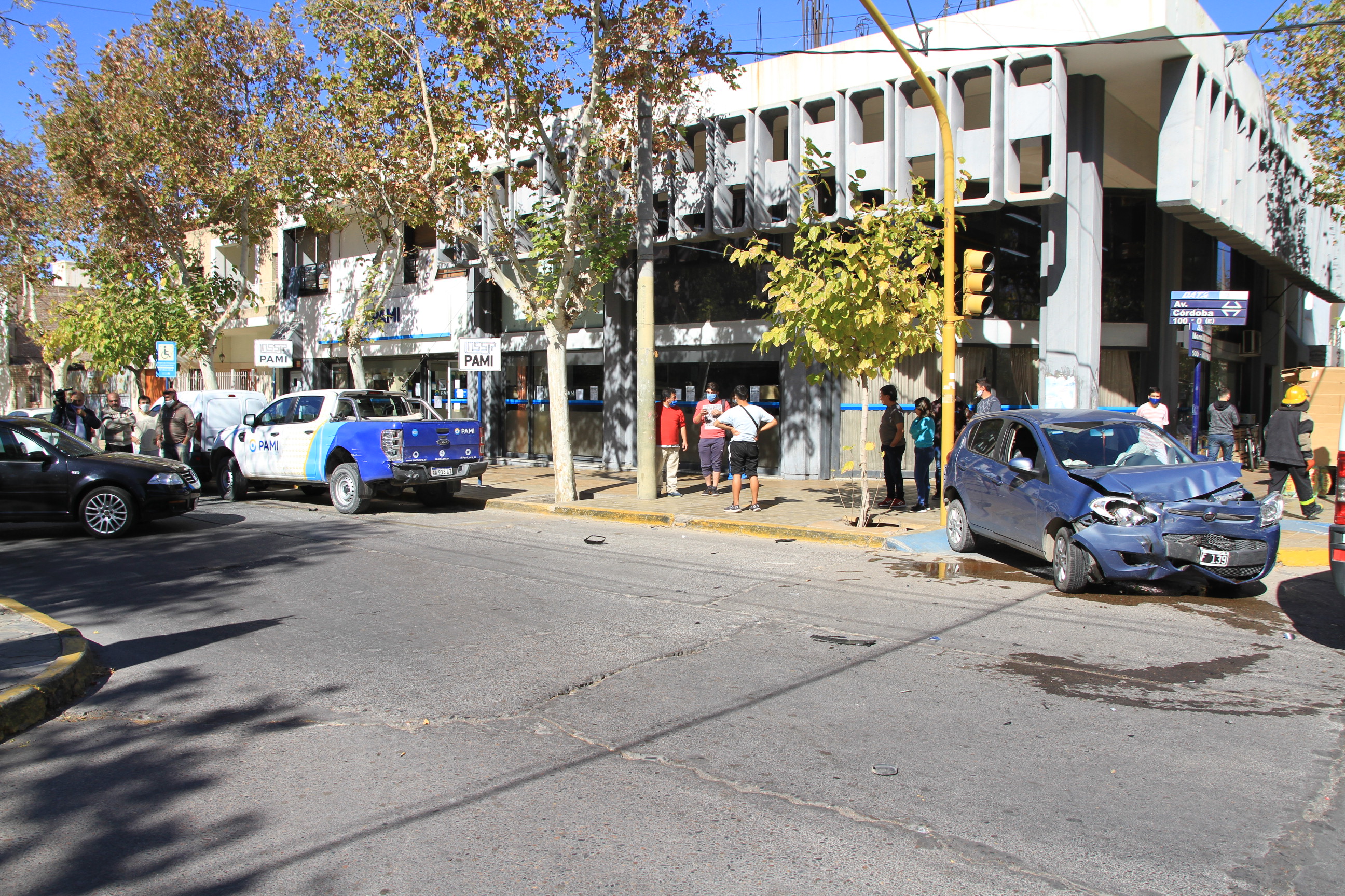 Pasadas las 14 de este jueves, se registró un fuerte accidente de tránsito en el cruce con semáforos de Mendoza y Córdoba, Capital, que dejó como saldo dos autos destrozados y también daños en una camioneta de una repartición nacional.
