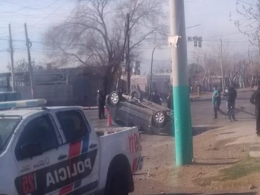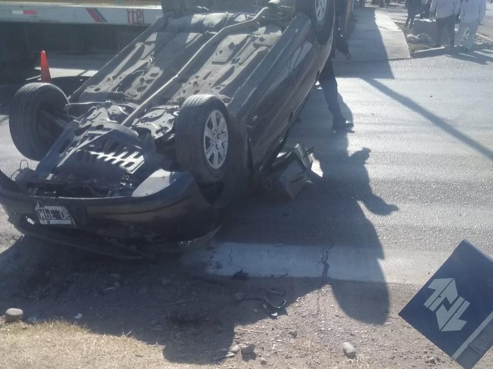 Este jueves cerca del mediodía, un auto quedó practicamente ruedas para arriba después de arrasar con un cartel nomenclador en una esquina de Rawson. El hecho ocurrió en calles Doctor Ortega, comúnmente llamada Superiora, y Vidart.