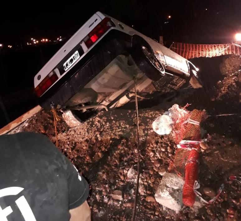 Anoche, en medio de la tormenta un automovilista no se percató de la señalización en una obra de cloacas (según muchos de los vecinos es deficiente la indicación en el lugar) y cayó al zanjón.