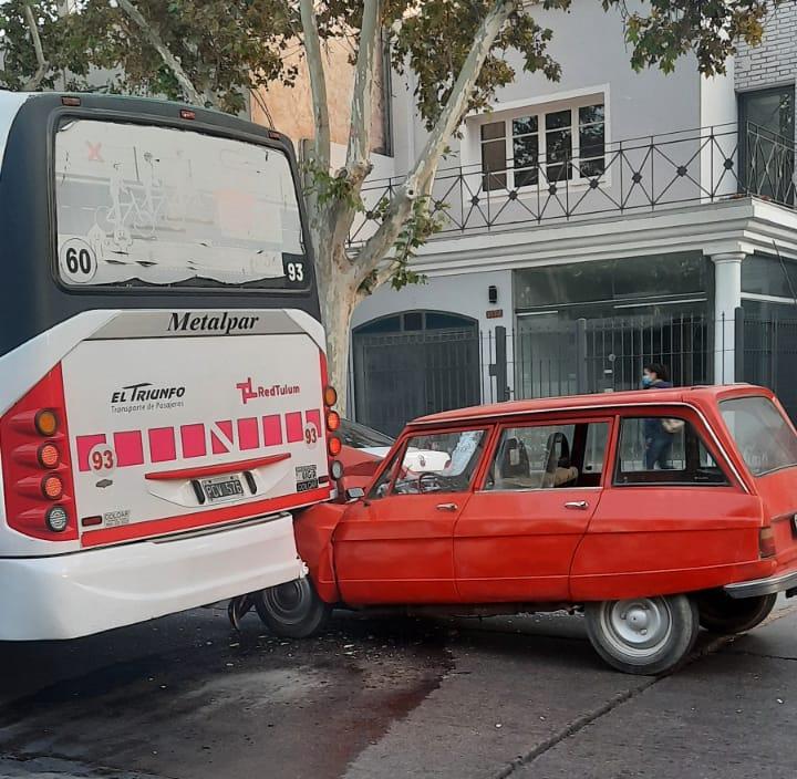 Un fuerte accidente se registró a primera hora de esta mañana en pleno centro, cuando un auto en el que viajaban dos personas impactó con la parte trasera de un colectivo y quedó destruido.
