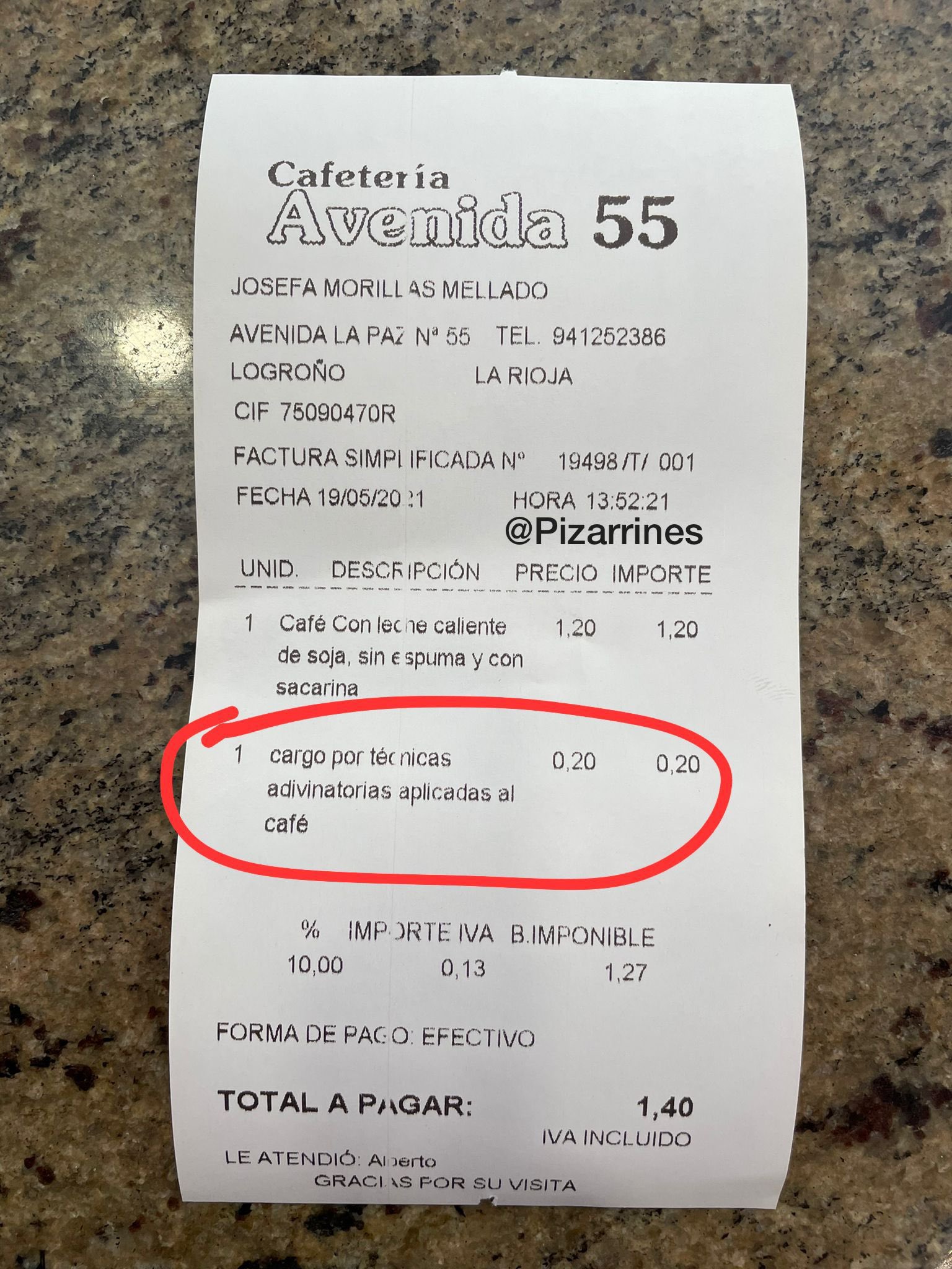 A su vez, el propietario del local, Alberto Álvarez explicó que se trata de una broma con clientes de toda la vida. “Somos una cafetería familiar y, al final, los clientes son más amigos que otra cosa. Con el cachondeo, te dicen ‘si al final vas a tener que cobrar por adivino’ y le he puesto el cargo en el ticket y se lo he dado”, sostuvo en diálogo con el Huffington Post.