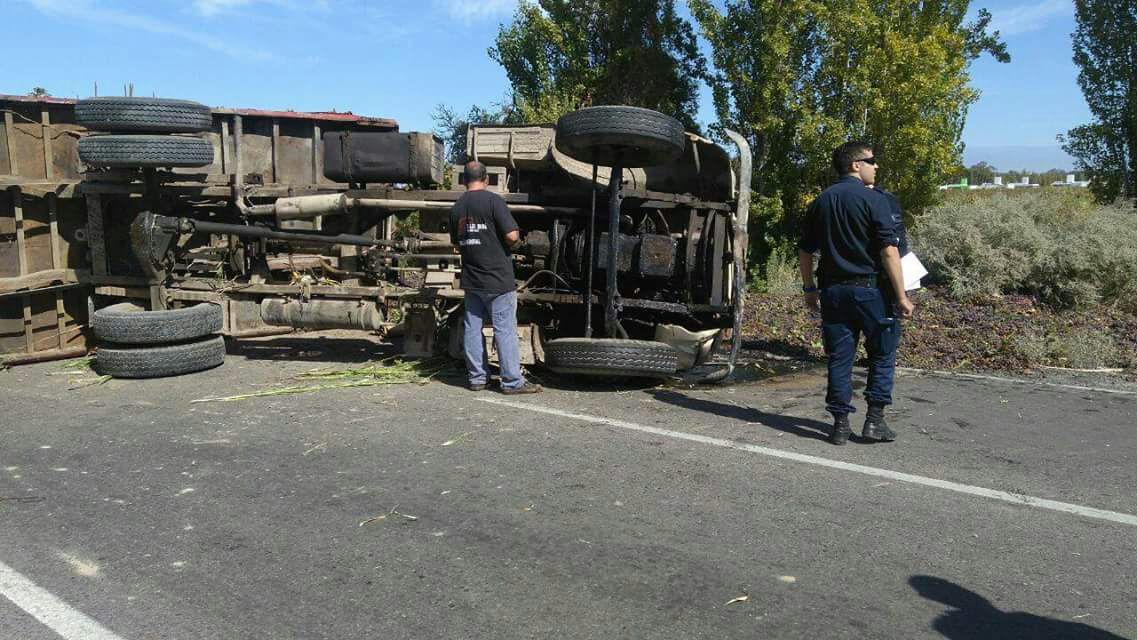 El vehículo era utilizado para trasportar una importante carga de uvas, que quedo desparramada por toda la calzada.
